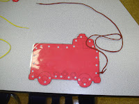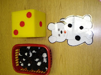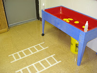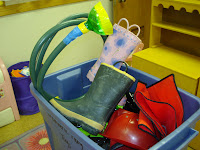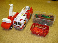 The picture on the left is one of the lacing boards I created. The picture on the right is a firefighter prop box for the dramatic play center. The children really enjoyed this activity. We had firefighters putting out fires and saving babies. We had a firefighter "office" where one child was answering phones and writing things down. Very funny. The prop box is filled with helmets, outfits, boots, hose, axes, fire extinguishers and so on.