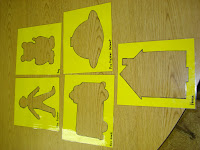 The picture on the left is our water table. It's filled with foam "fire." The children went to the center and put out the fire by spraying the "fire" with the spray bottles. This was a great fine motor activity. The picture on the right are stencils. Some children used the stencils to write stories, others used them to fill in with bingo dotters, while other children used the stencils to draw.