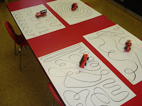 The picture on the left are our fire truck routes. Children followed the lines with their firetrucks. The picture on the right is a math game I created. Children rolled the dice to see how many spots their dalmation needed.